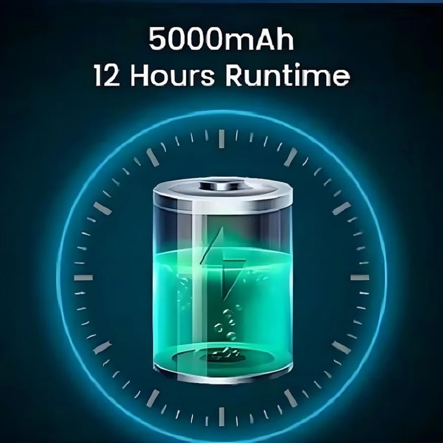 Carregamento rápido tipo C: bateria de íon de lítio de 5000mAh integrada, carrega totalmente em 2 horas - autonomia de 12 horas.